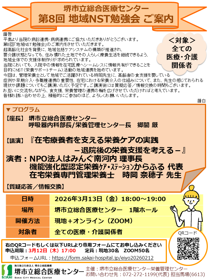 | 問合先 | 堺市立総合医療センター 栄養管理科 NST馬場 TEL:072-272-1199(代表) e-mail:eiyo@sakai-hospital.jp |