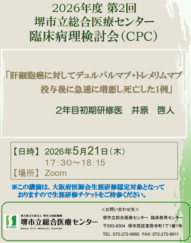 | イベント | 2026年度 第2回 堺市立総合医療センター 臨床病理検討会(CPC) |