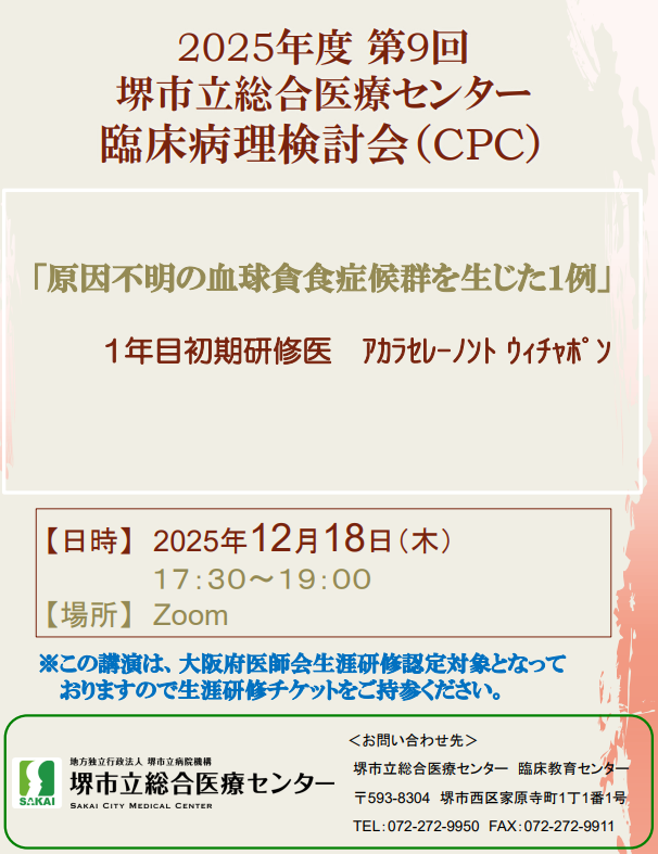 | イベント | 2025年度 第9回 堺市立総合医療センター 臨床病理検討会(CPC) |