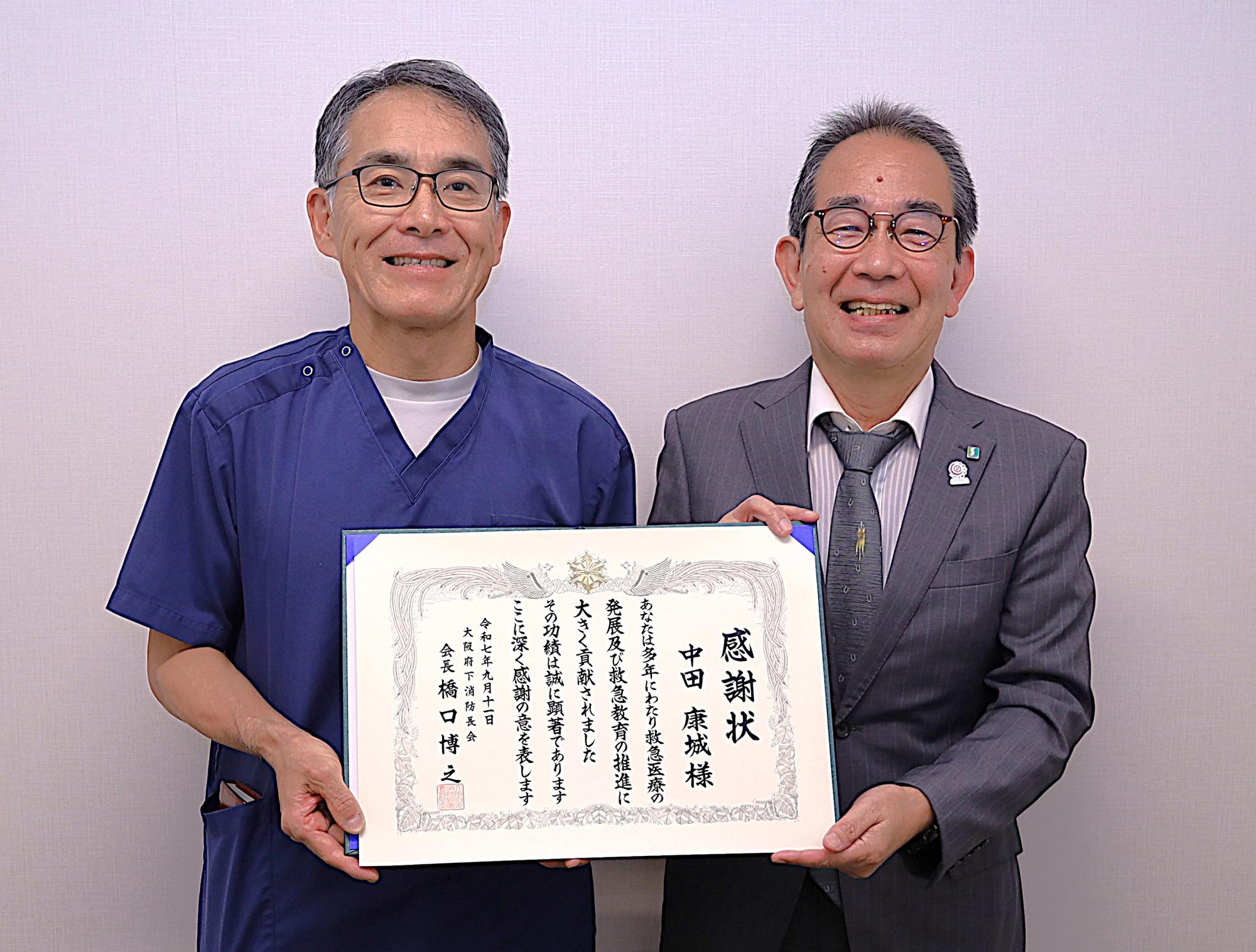 副院長の中田康城が救急医療功労者として大阪府下消防長会会長より感謝状を贈呈されました。