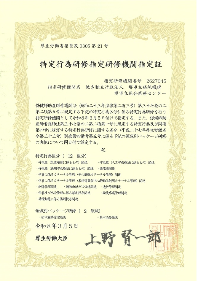 このたび、令和8年3月5日付けで厚生労働省から「特定行為研修指定研修機関」として指定されました。